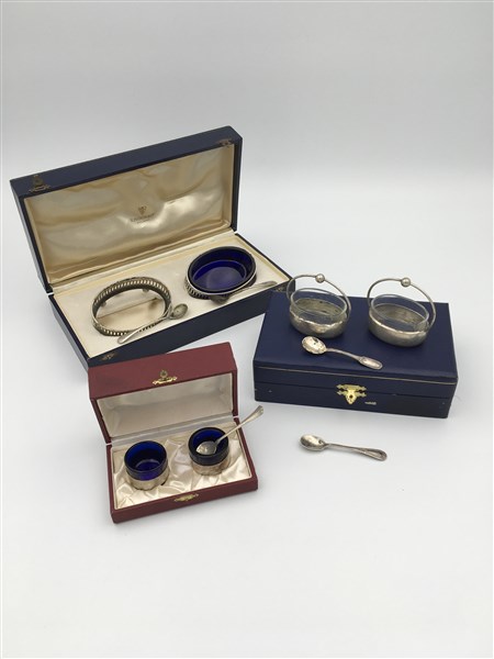 Gruppo di tre custodie contenenti tre coppie di saliere in argento con vasche i