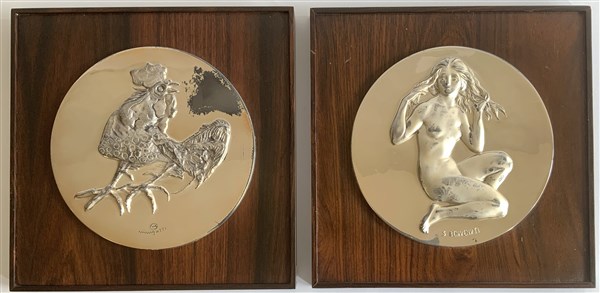 Lotto di due tondi in lamina metallica raffiguranti un gallo firmato Minguzzi e un nudo femminile firmato Benvenuti (d cm 20), cornici in legno