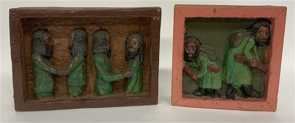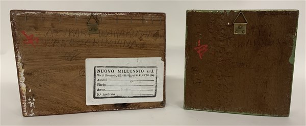 Due pannelli in legno intagliato e dipinto in policromia (misure diverse) (dife