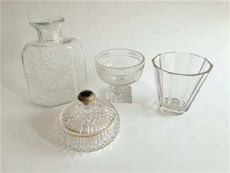 Lotto composto da una bottiglia in vetro, due vasi in cristallo ed un portadolc