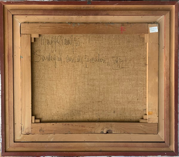 "Sardegna, case di pescatori" olio su tela (cm 60x80) Firmato e datato '72 in basso a sinistra . Al retro: firmato, titolato e datato. In cornice