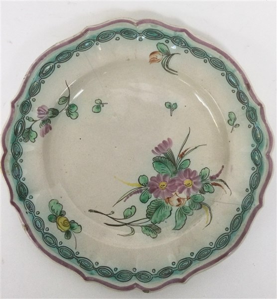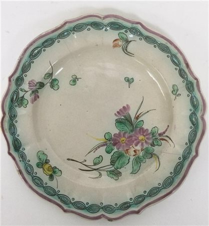 Piatto in maiolica polilobato decorato a fiori nei toni del verde, violetto e giallo, secolo XVIII (d cm 24) (difetti e restauri)
