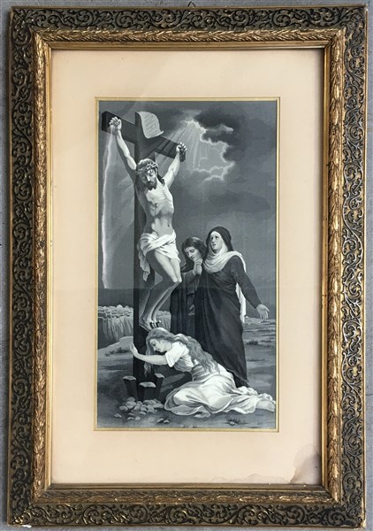 Ricamo meccanico raffigurante Cristo in croce fra le pie donne (cm 32x18), in cornice (lievi difetti)
