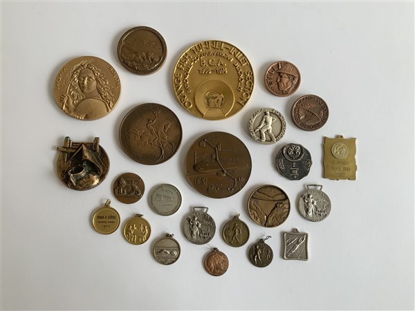 Scatola contenente tre monete e numerose medaglie alcune d'Artista tra i quali