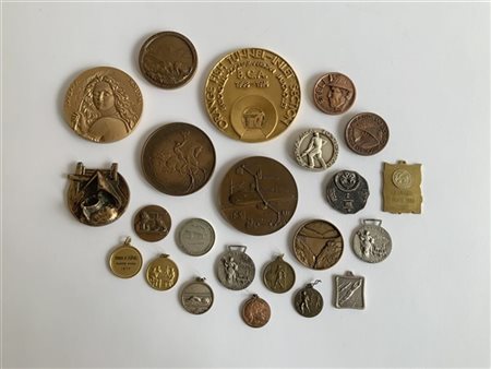 Scatola contenente tre monete e numerose medaglie alcune d'Artista tra i quali Messina, Lello Scorzelli, in metalli diversi tra i quali l'argento (difetti)