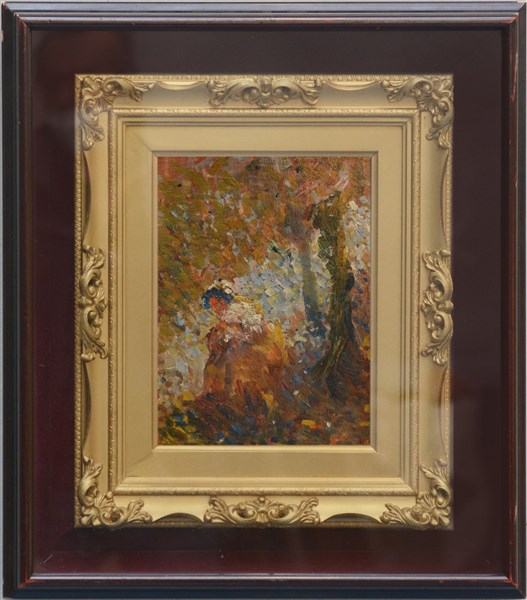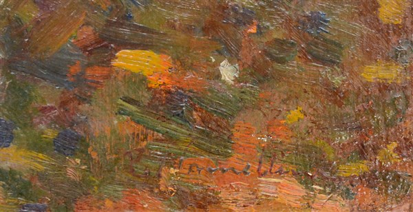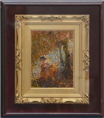 Ignoto "Figura in un paesaggio" olio su cartone (cm 24.5x17) Reca iscrizione P.Nomellini in basso a destra. In cornice