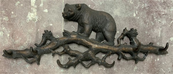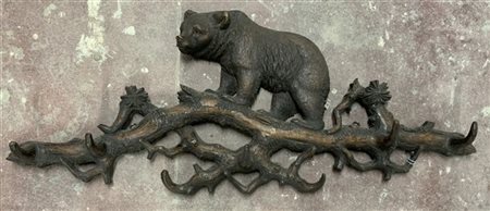 Appendiabiti a cinque pioli in legno intagliato a forma di orso su ramo con occhi in vetro. Foresta nera, secolo XX (l cm 100, h cm 40) (lievi difetti)