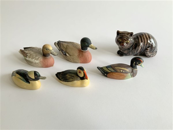 Lotto composto da due anatre in porcellana della manifattura di Coalport, tre anatre in materiale sintetico ed un gattino in terracotta di manifatture differenti (lievi difetti)