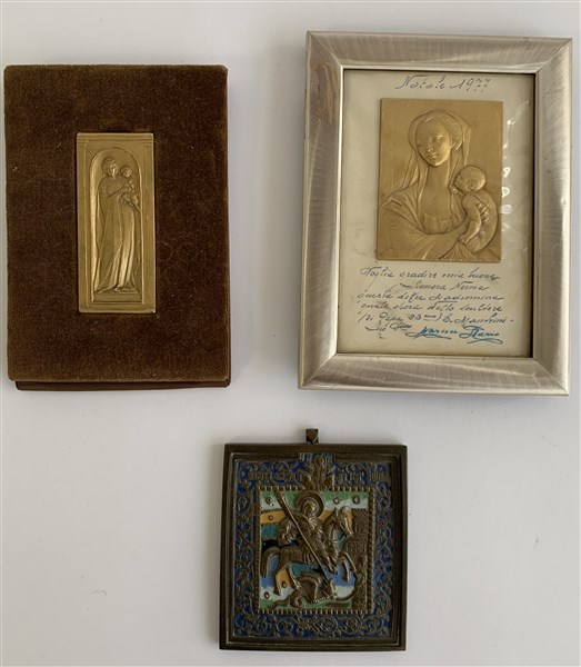 Lotto composto da un'icona da viaggio raffigurante san Giorgio e il drago, e due bassorilievi in bronzo dorato raffiguranti la Madonna con Bambino di Manfrini (cm 8,5x9 e 3,5x8) (lievi difetti)