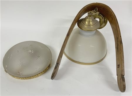 Lotto composto da una lampada a sospensione con calotta in vetro lattimo ed elemento decorativo in legno unita a una lampada da parete in vetro trasparente parzialmente acidato e decorato a stelle. Italia, secolo XX. (misure diverse) (lievi difetti)