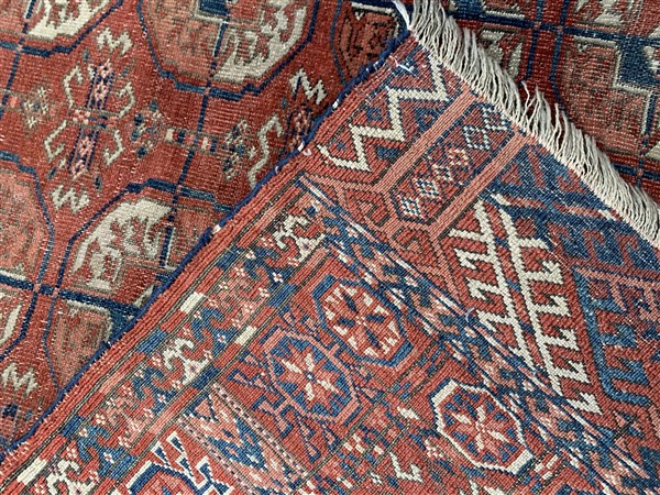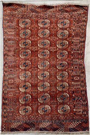 Tappeto Boukhara, Turkestan occidentale, fine Secolo XIX. Decoro con file di GÜl su fondo rosso. (difetti, rapature e mancanze)(cm 163x106)