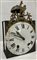 Quadrante in smalto bianco a numeri romani per le ore e arabi per i minuti, movimento a due treni con scappamento a verga rovesciata e suoneria delle ore e mezze su campanello.