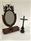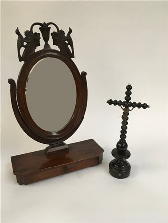 Lotto composto da una psiche da tavolo con cassetto, specchio basculante con cimasa intagliata a foglie e uccelli, e un crocifisso in legno tornito ed ebanizzato con Cristo in metallo, secolo XIX (difetti)