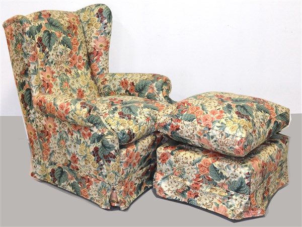Lotto composto da una bergère ed un pouf rivestiti in tessuto floreale (difetti