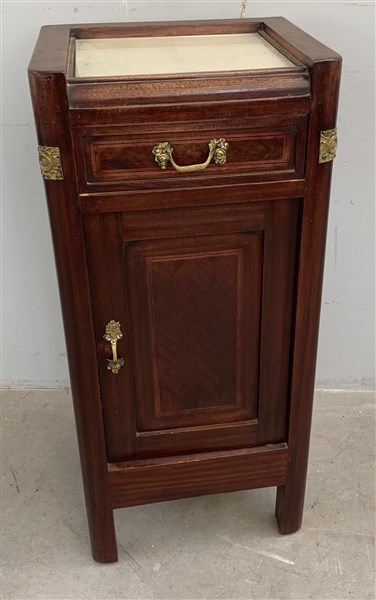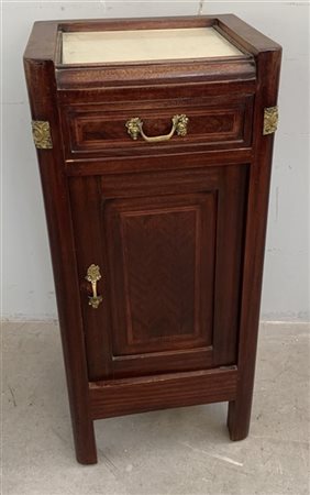 Comodino liberty in legno ad uno sportello e un cassetto con piano in vetro, minuterie in ottone. Italia, anni '10. (cm 39x87x31) (lievi difetti)