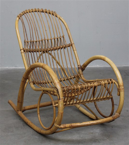 Sedia a dondolo in giunco, malacca, manao e scortecciato. Italia, anni '70. (cm 100x94x60) (difetti)