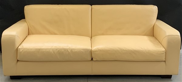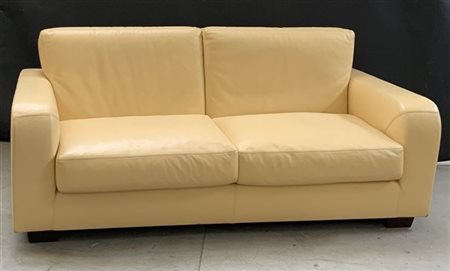Lotto composto da un divano a due posti e un divano a tre posti imbottiti e rivestiti in pelle color vaniglia. Italia, anni '90/2000. (divano a due posti cm 180x76x95; divano a tre posti cm 203x76x95) (lievi difetti)