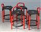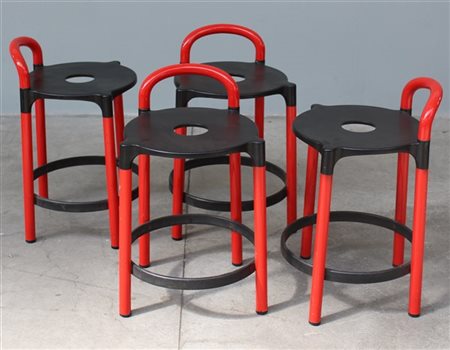 Quattro sgabelli modello "Polo". Produzione Kartell, Milano, anni '70. Tubolare metallico e legno rosso, materiale plastico nero. (h cm 78; d cm 42) (Lievi difetti e piccoli restauri )