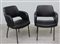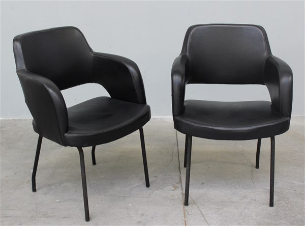 Coppia di poltroncine con struttura in metallo, seduta e schienale imbottiti e rivestiti in pelle nera. (cm 59x83x58)