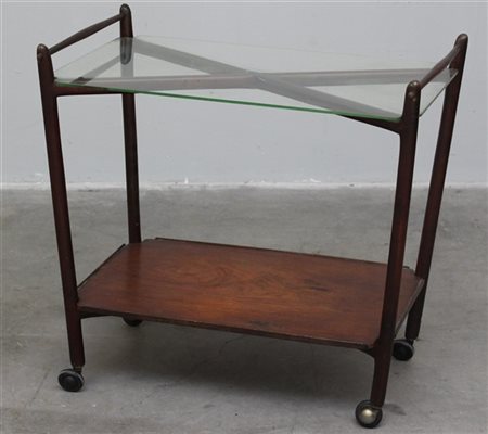 Carrello con struttura in legno, piano superiore in vetro. Italia, anni '70. (cm 76x72x43) (difetti, piccole mancanze e restauri)
