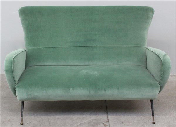Divanetto a due posti imbottito e rivestito in velluto verde piedini in ottone. Italia, anni '50/'60. (cm 135x87x70) (restauri)