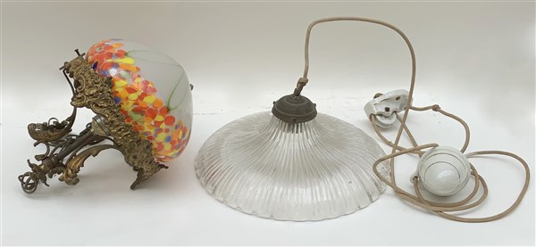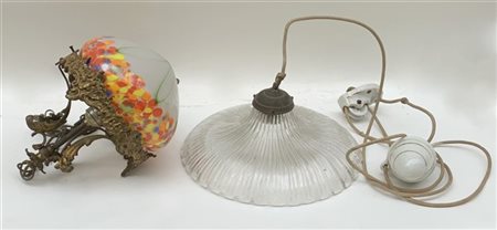 Lotto composto da una lampada a sospensione con struttura in ottone, paralume in vetro lattimo con murrine policrome e filamenti verdi unita a una lampada saliscendi con paralume in vetro trasparente incolore. Italia, secolo XX. (misure diverse) (lievi difetti)