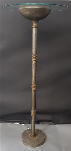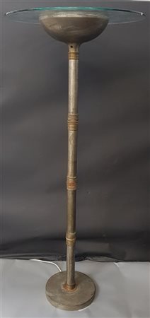 Lampada da terra con struttura in ottone nichelato e naturale, disco in vetro. Italia, anni '60. (h cm 180) (difetti, restauri e piccole mancanze)