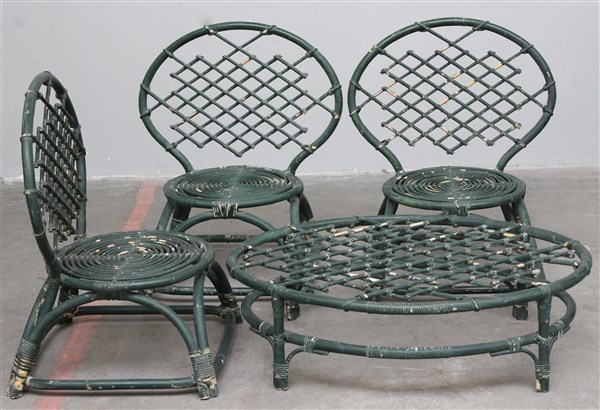 Salottino da esterno composto da un tre poltrone e un tavolino in manao con legature in scortecciato verniciato verde. Italia, anni '50/'60. (poltrone cm 71x72x60; tavolino cm 103x30x80) (difetti e piccole mancanze)