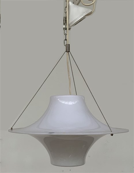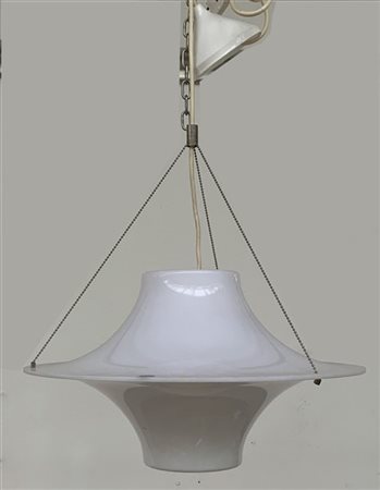 Lampada a sospensione modello "Skyflyer Lokki". Produzione Sanka Oy, Finlandia, anni '60. Struttura in acciaio, calotta in metacrilato. (h cm 32; d cm 70)