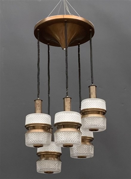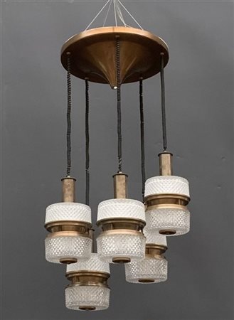 Lampada a sospensione a cinque luci in ottone e vetro stampato. Italia, anni '60. (h cm 93) (lievi difetti)