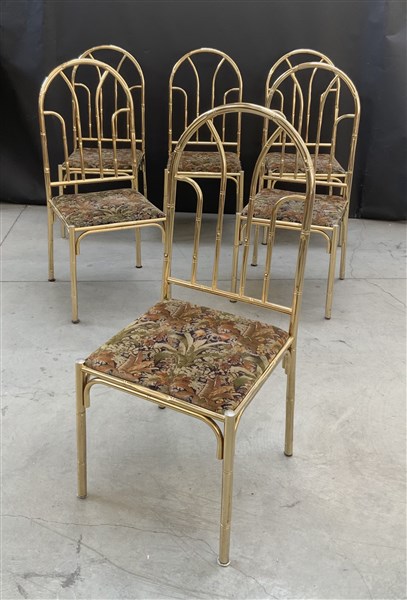Fornitura da pranzo composta da sei sedie ed un tavolo in ottone conformati a f