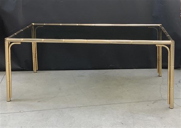 Fornitura da pranzo composta da sei sedie ed un tavolo in ottone conformati a finto bamboo, piano del tavolo in vetro fumè. Italia, anni '70. (sedie cm 45x105x45; tavolo cm 178x72x87,5) (lievi difetti)