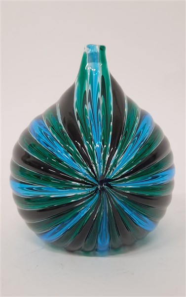 Vaso soliflore in vetro soffiato a fasce incolore, azzurro, verde e nero. Italia, 1983. Firmato a punta sotto la base. (h cm 18)