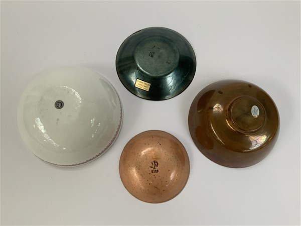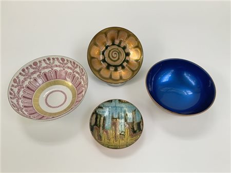 Lotto composto da quattro ciotole in rame smaltato di diverse dimensioni e di manifattura danese, Eva Scherer, Studio Cellini e Vigna Nuova. Secolo XX. (difetti)