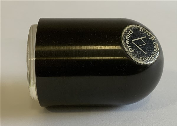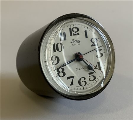 Orologio da tavolo modello "Static". Produzione Lorenz, Italia, 1984, disegno del 1959. Metallo verniciato nero. Recante etichetta "Premio compasso d'oro" sotto la base. (cm 6,5x10,8) (difetti)