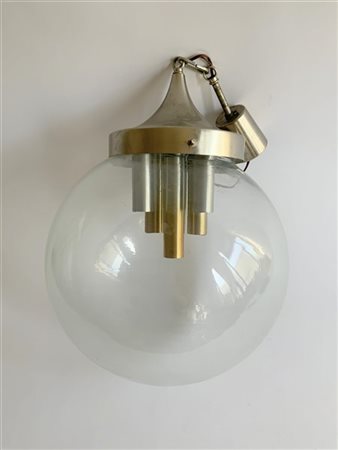 Lampada a sospensione con diffusore in vetro trasparente incolore. Anni '70. (h cm 65) (lievi difetti)