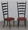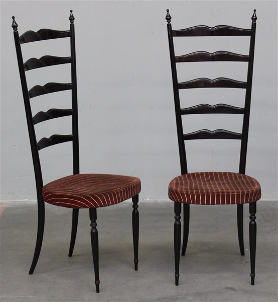 Coppia di sedie chiavarine da camino con gambe in legno tornito, schienale a giorno, seduta imbottita e rivestita in velluto a righe bordeaux e bianche. Italia, anni '40/'50. (cm 42x124x40) (difetti)