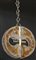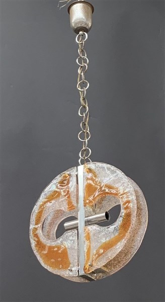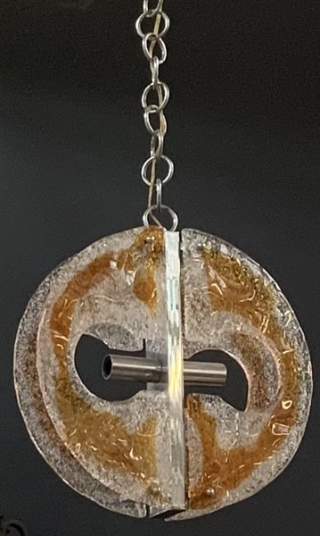Coppia di lampade a sospensione con struttura in metallo cromato, paralumi in vetro soffiato corrugato trasparente incolore e pagliesco. Italia, anni '70. (h cm 95) (difetti e restauri)