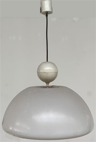 Lampada a sospensione con calotta in metacrilato bianco e struttura in metallo verniciato bianco. Italia, anni '70. (h cm 80; d cm 52) (difetti)