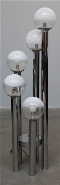 Lampada da terra a cinque luci disposte a spirale con struttura in acciaio cromato e diffusori globulari in vetro incolore e lattimo. Italia, anni '70/'80. (h cm 117)