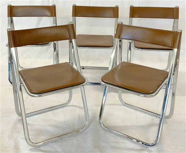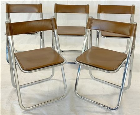 Gruppo di cinque sedie pieghevoli modello "Tamara". Pordenone, anni '70. Metallo cromato, seduta e schienale in pelle marrone. Recante marchio del produttore. (cm 42x78,5x45,5) (lievi difetti)