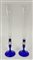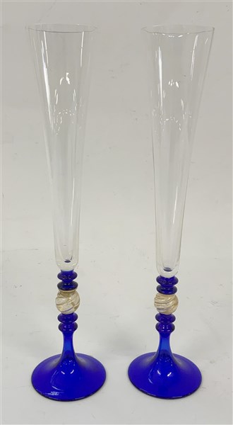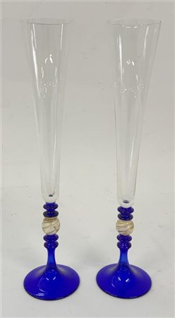 Due calici in vetro soffiato trasparente incolore con base in vetro soffiato trasparente blu e incolore con applicazione di foglia d'oro. Murano, anni 2000. Firmati all'acido sotto la base. (h cm 33,5)