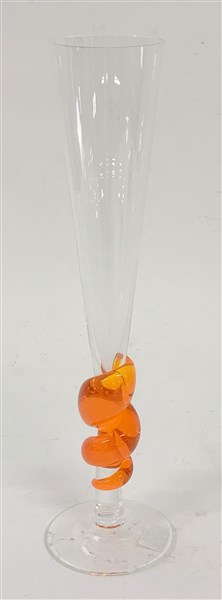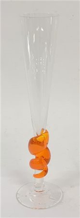 Calice in vetro soffiato trasparente incolore e arancio. Murano, 2001. Firmato alla base "Carlo Moretti per Accenture" e datato "7-7-2001". (h cm 27,5)