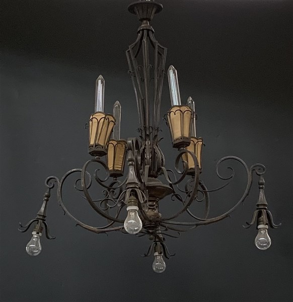 Lampada a sospensione in ferro battuto di gusto barocchetto a otto luci disposte su due ordini. Paralume in stoffa. Milano, anni '10/'20. (h cm 110; d cm 103) (difetti e mancanze)