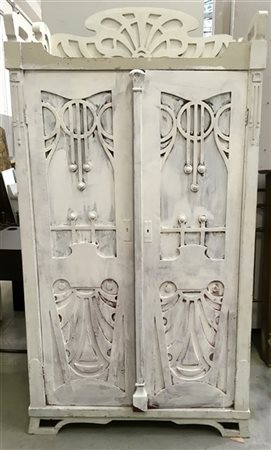 Armadio Liberty in legno dolce verniciato bianco con due sportelli decorati a motivi geometrici e cimasa sagomata (111x220x61). (cm 111x220x61) (difetti e restauri)