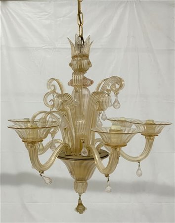 Lampada a sospensione a sei luci in vetro soffiato trasparente pagliesco. Italia, anni '50. (h cm 88) (lievi difetti e mancanze)