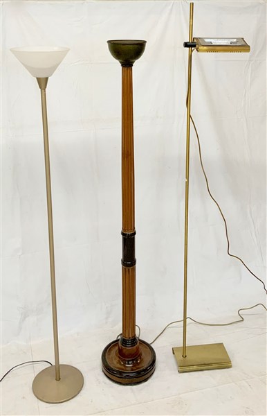 Lotto composto da una lampada da terra con fusto e base in legno unita a due lampade da terra con struttura in ottone e metallo verniciato bronzo. Italia, seconda metà secolo XX. (h max cm 196,5)