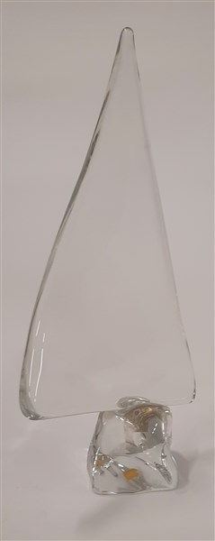 Scultura in vetro massello trasparente incolore raffigurante una vela. Francia, secolo XX. Firmato a punta sotto la base. (h cm 40)