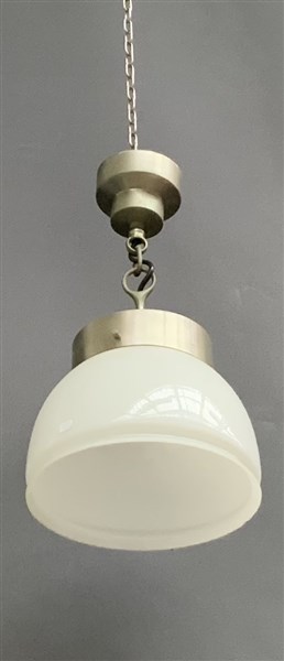 Coppia di due lampade a sospensione modello "Delta". Produzione Artemide, Milano, 1960. Struttura in ottone nichelato, diffusore in vetro lattimo. (h cm 44; d cm 22) (difetti e mancanze)