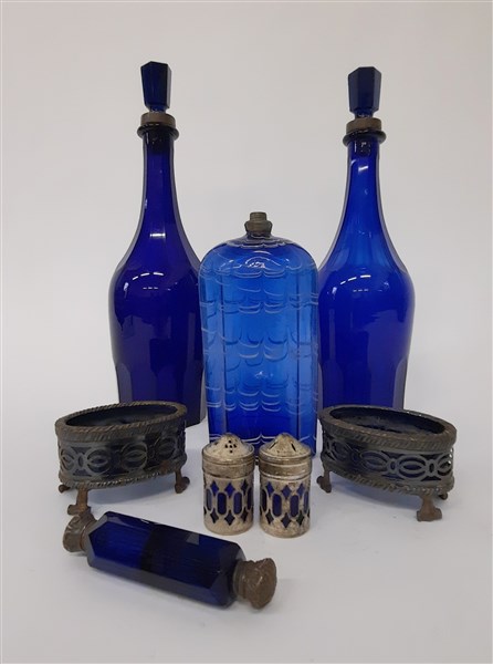 Lotto composto da due bottiglie con tappo in cristallo blu unite a una bottiglia in vetro soffiato trasparente blu e decori in vetro lattimo, una fiala in cristallo sfaccettato a doppio tappo, una coppia di saliere in cristallo blu con struttura in argento, una coppia di contenitori sale-pepe in metallo argentato con contenitori in cristallo blu. (misure diverse) (lievi difetti)